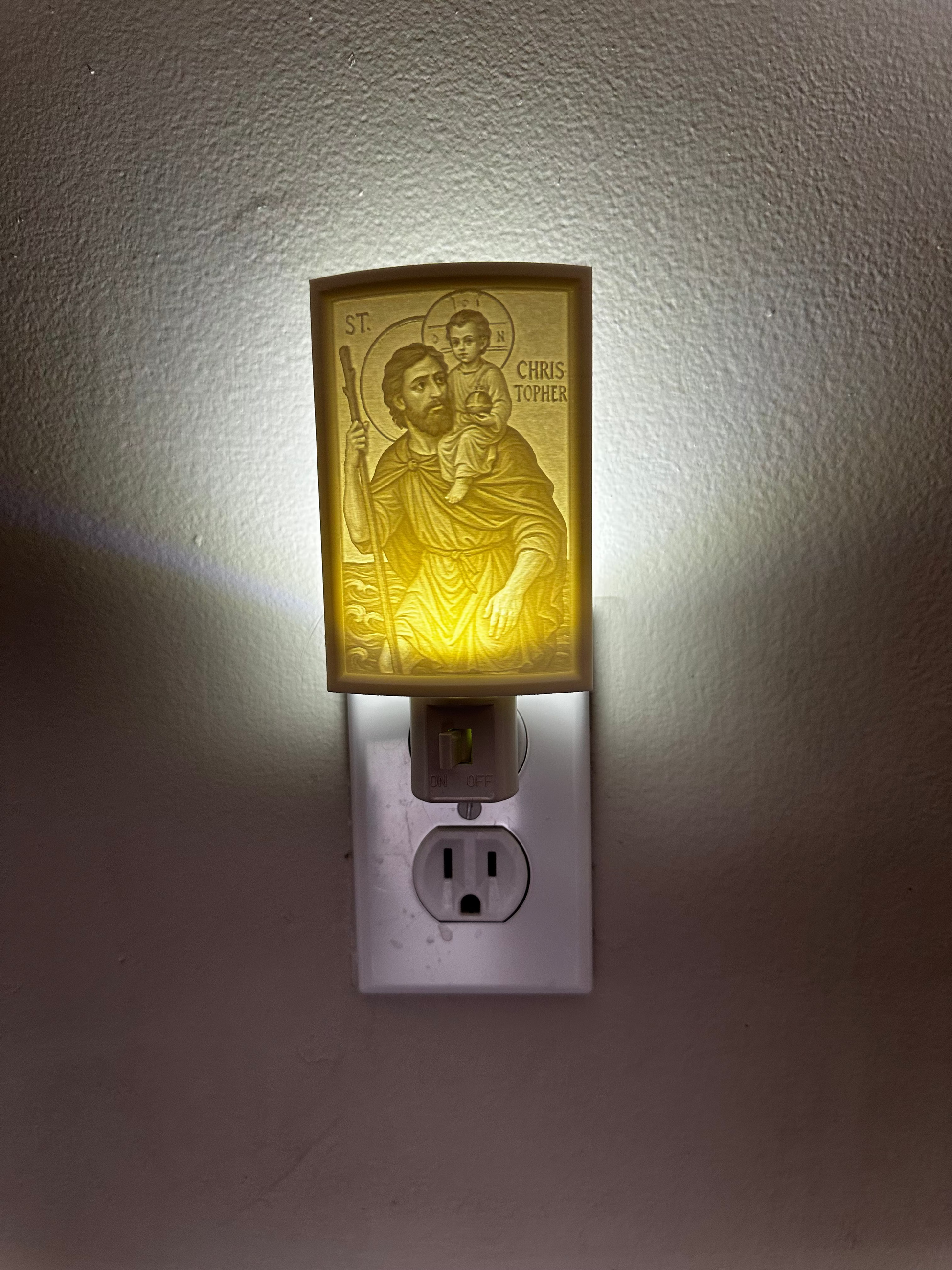 When illuminated, the dimensional lithophane transforms into a glowing portrait of St. Christopher, often depicted carrying the infant Jesus upon his shoulders. The gentle, guiding light creates a perfect blessing for entryways, vehicles, or bedrooms—serving as a visible reminder of God's protection over all your comings and goings, whether across town or around the world.